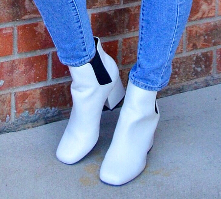 Step 2: WHITE BOOTIES. This is the latest shoe trend and I am 100% on board. There is no such thing as "no wearing white after labor day" anymore. Toss that belief in the garbage, out of sight out of mind. Now personally I love outfits with white pants, but knowing myself I cant own any. I will ruin them within 5 seconds of putting them on. Shoes however I can manage (even though I low-key already scuffed them). These instantly add a brightness and edge to your outfit. There isn't an outfit I cant wear these with, and they are a perfect transition shoe into Spring!